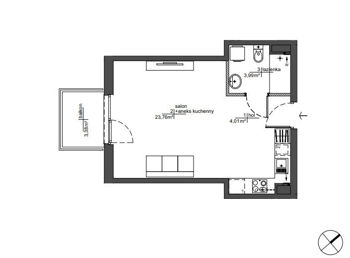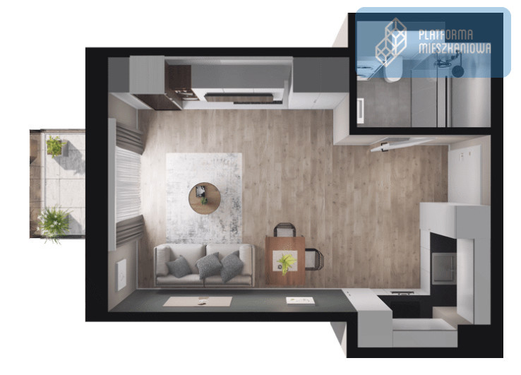 Przestronny salon z aneksem kuchennym i wyjściem na balkon