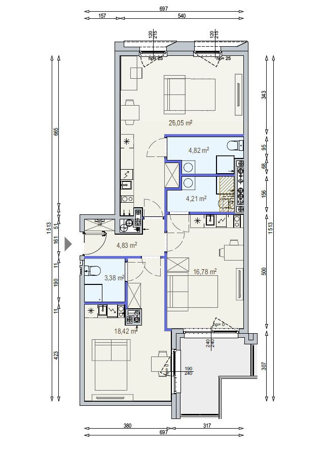 - salonu z aneksem kuchennym: 26,05 m2 oraz łazienki: 4,82 m2