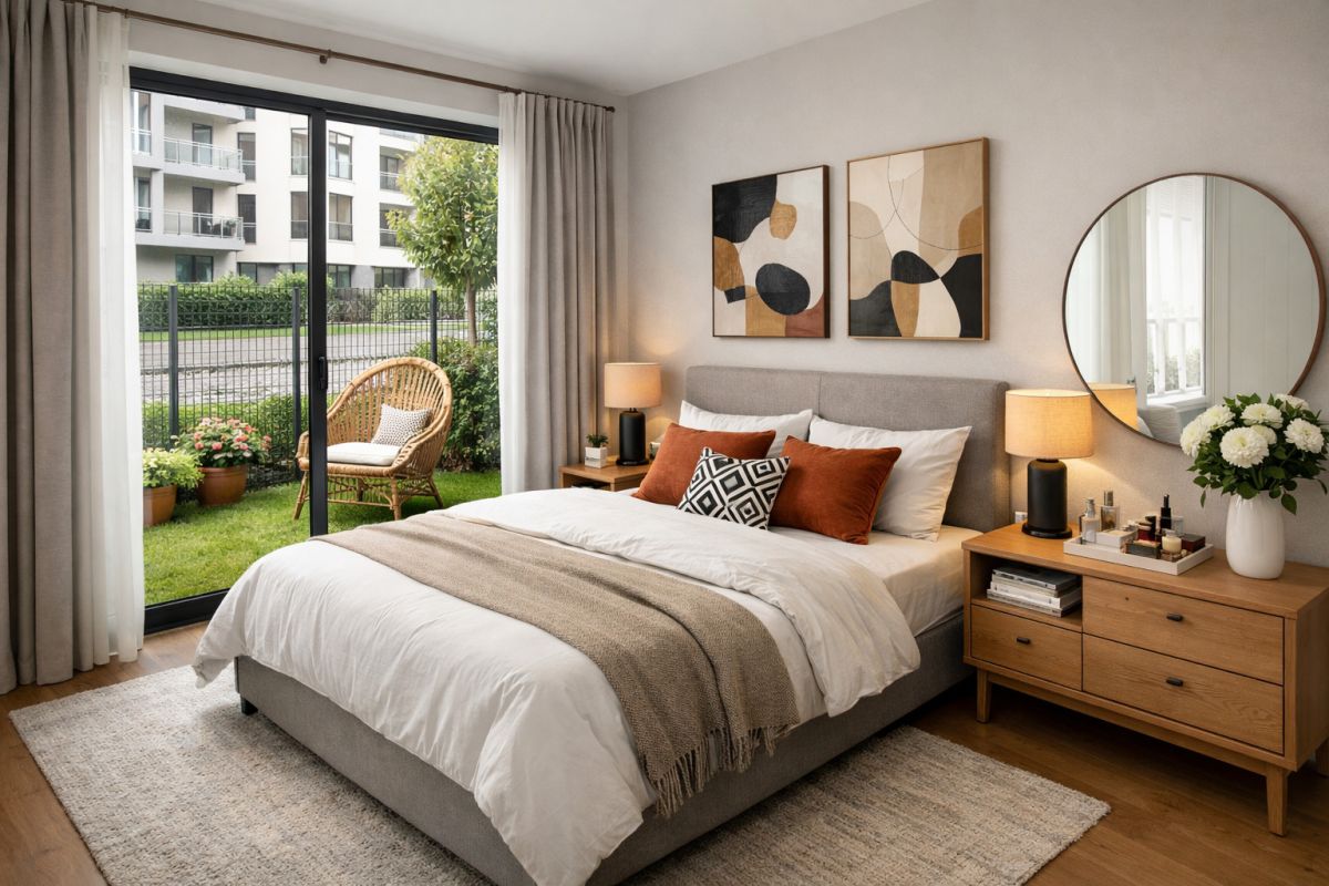 Mieszkanie z dwoma ogródkami w standardzie deweloperskim na Mokotowie, w nowoczesnym budynku.