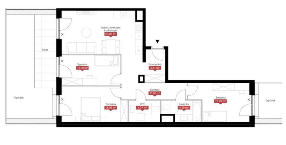 - trzech sypialni: 11,96 m2; 13,79 m2; 15,06 m2