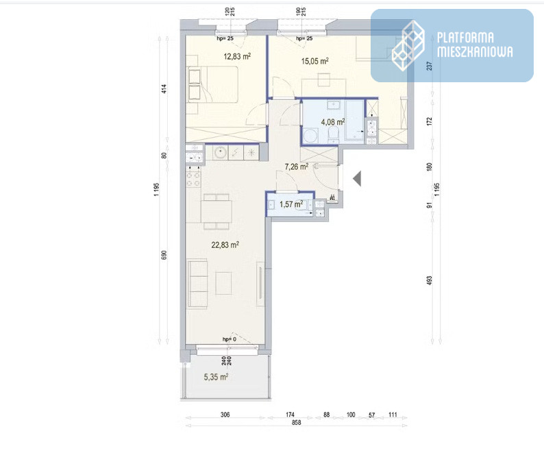 - dwie sypialnie: 12,83mkw, 15,05mkw (z garderobą),