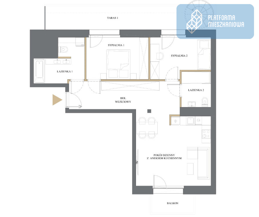 Duża strefa dzienna z aneksem, dwie sypialnie i dwie łazienki — układ, który sprawdza się zarówno do życia, jak i pracy z domu.