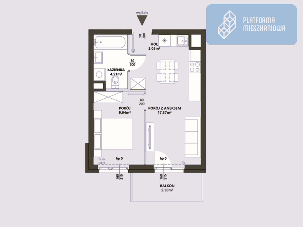 - Pokój dzienny z aneksem kuchennym i wyjściem na balkon