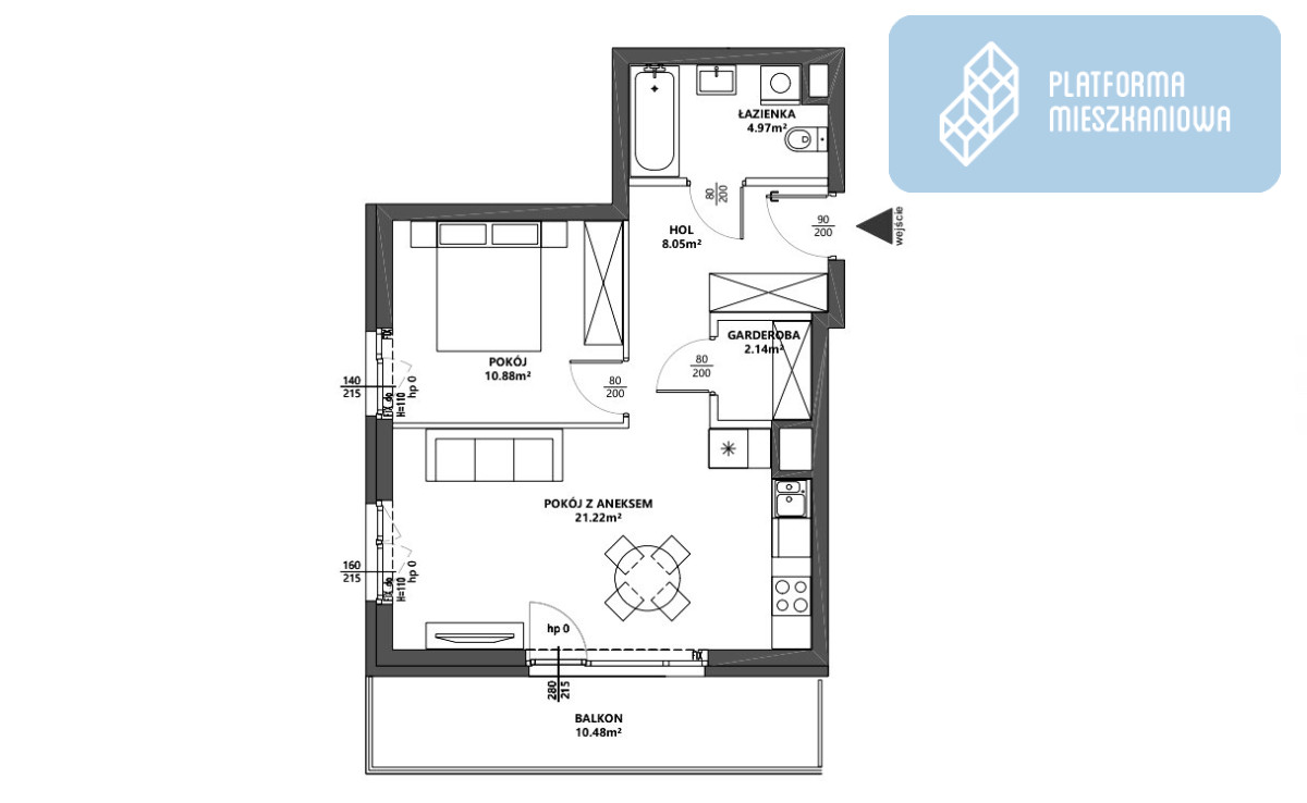 - Pokój dzienny z aneksem kuchennym i wyjściem na balkon
