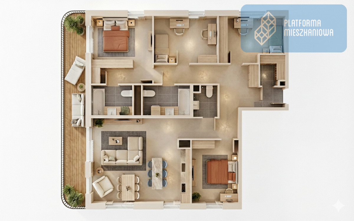 - Sypialnia główna z prywatną łazienką oraz wyjściem na taras