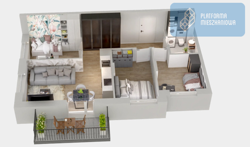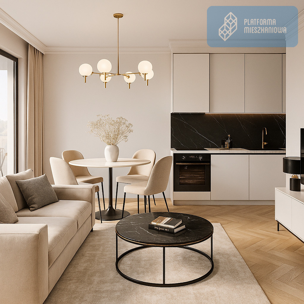 - Przestronny salon z aneksem kuchennym i wyjściem na balkon