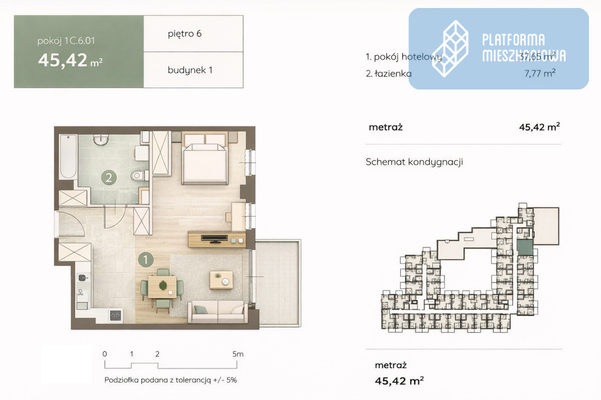 • Liczba pokoi: 2 ( pokój hotelowy: 37,65m2, łazienka: 7,77m2)