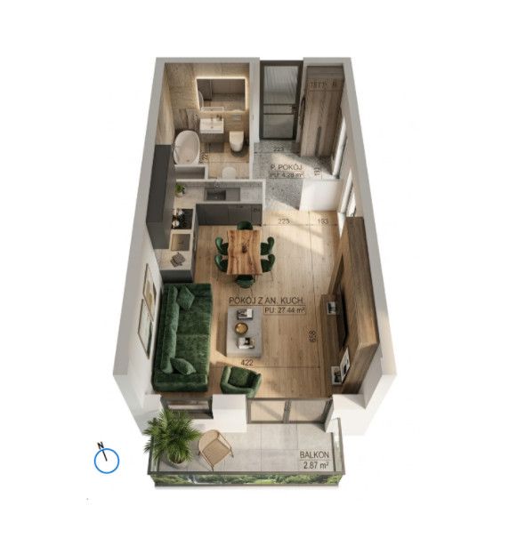 Rozkład lokalu pozwala na efektywne wykorzystanie każdego metra kwadratowego. Jest to odpowiednia przestrzeń dla singla, pary lub jako produkt inwestycyjny pod wynajem długoterminowy.