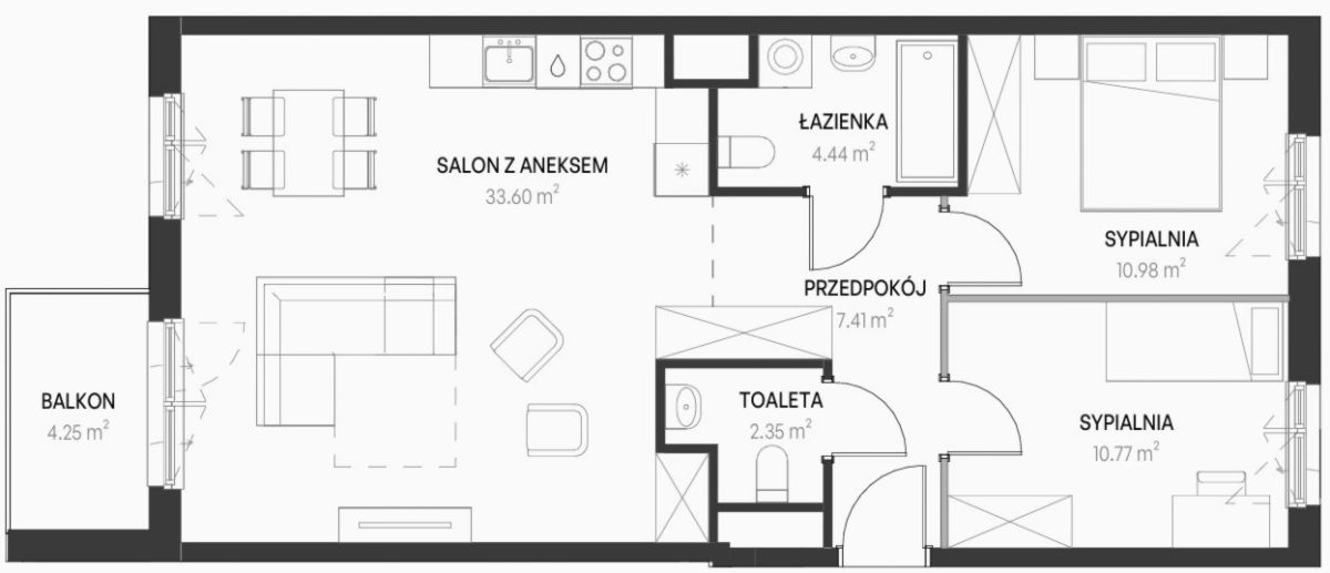 - Przestronny salon z aneksem kuchennym o pow. 33,60m2 i wyjściem na balkon o pow. 4,25m2,