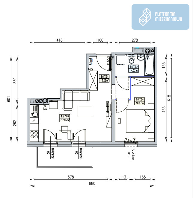 - Smart rozwiązania i opcja „pod klucz” - podstawowa wersja systemu inteligentnego zarządzania mieszkaniem (oświetlenie, czujnik zalania itp.), a także możliwość wykończenia mieszkania „pod klucz”, co pozwala uniknąć formalności.