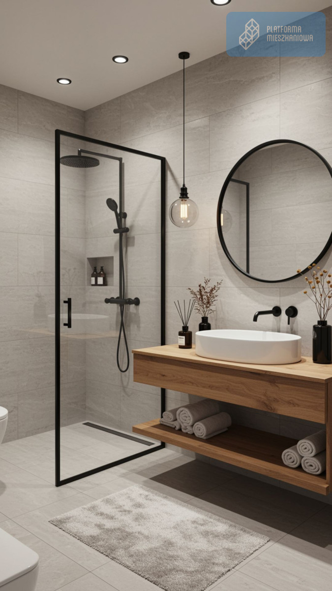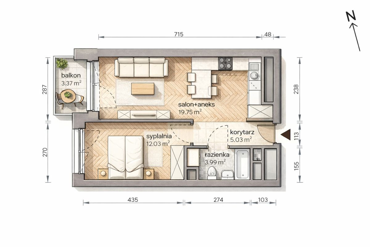 - Układ: 2 pokoje (sypialnia + salon z aneksem kuchennym)