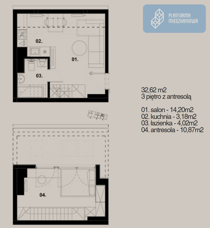 • Antresola - 10,87 m² (idealna na sypialnię lub strefę pracy)
