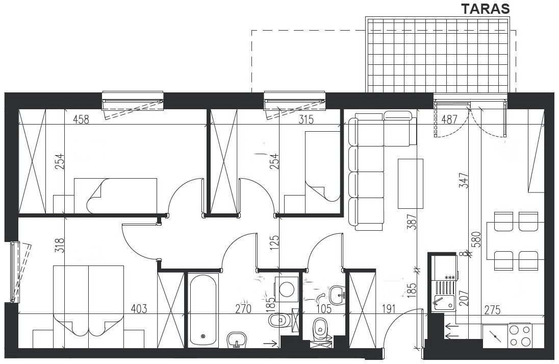- Funkcjonalny układ z dużą ilością miejsc pod zabudowę szaf,
