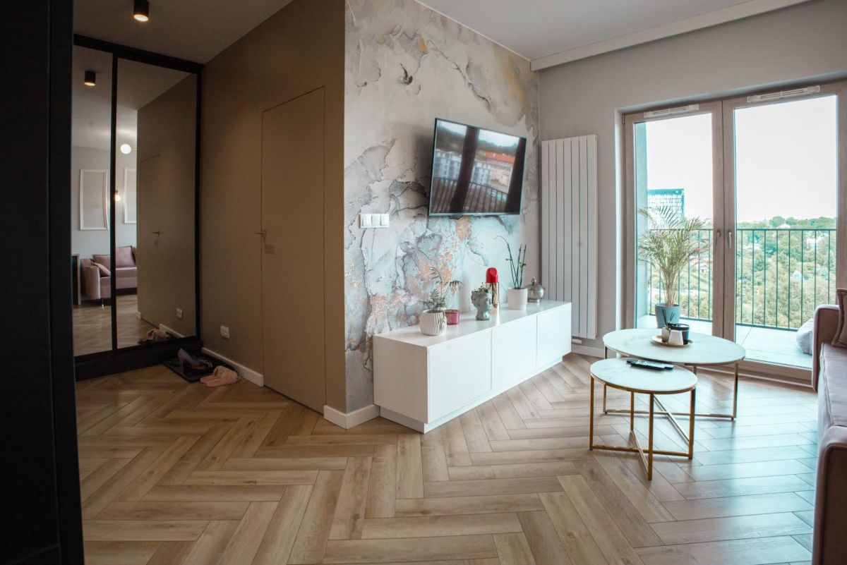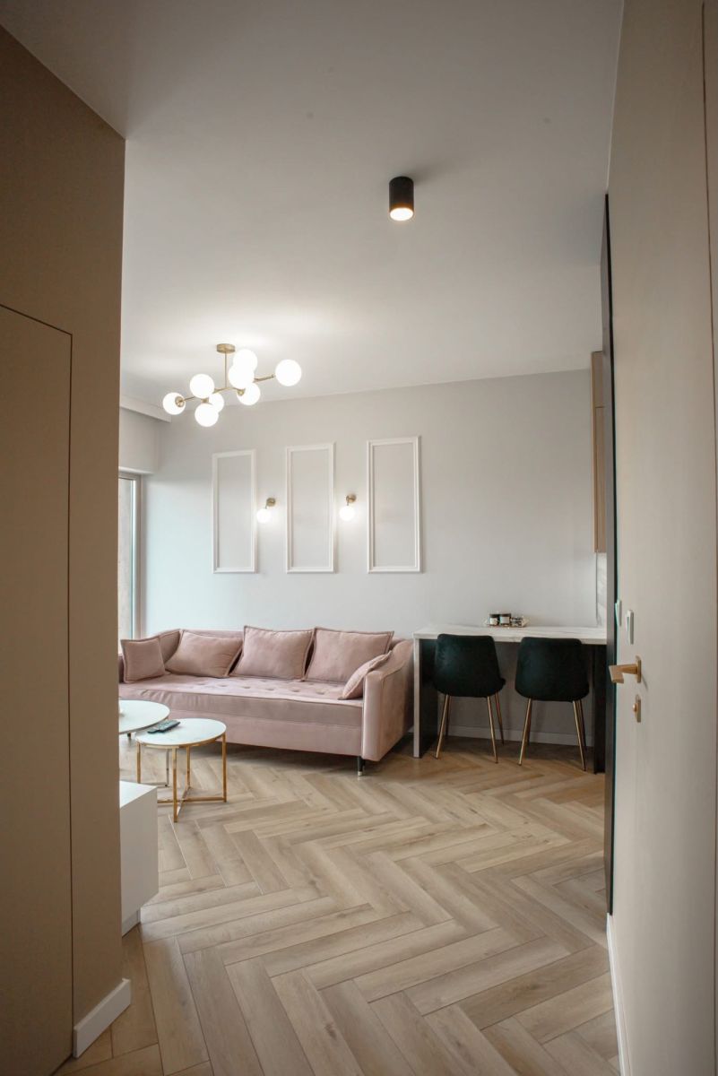 Mieszkanie zostało zaprojektowane przez architekta wnętrz i wykończone w wysokim standardzie, z dbałością o funkcjonalność i estetykę. Z okien rozciąga się widok na otwartą przestrzeń, bez bezpośredniego sąsiedztwa innych budynków, co zapewnia prywatność i komfort.
